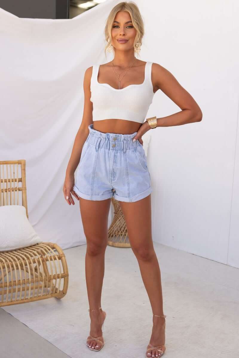 Denim paperbag waist shorts