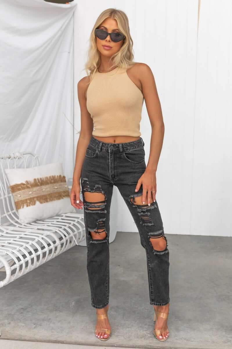 Taylah wears size 6/XS - Slightly tighter fit, if you want a more relaxed mom look we suggest going up a size