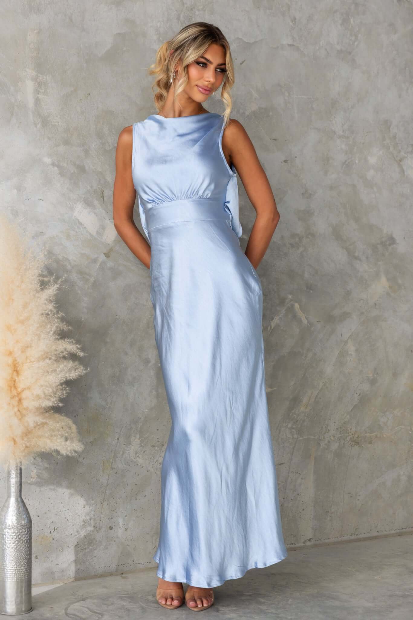 Blue, high neck, satin, bridesmaid, maxi dress, elegant, sophisticated, chic, sleek, luxurious, flowy, timeless, classic, graceful, flattering, modern, refined, stylish, formal, radiant, polished